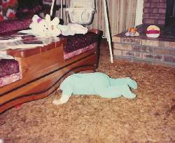 ~ "Hehehe, Nobody will find me here! Edie ~ "Baby Bubba hasn't quite grasped the game of hide & seek." June Bug ~ "Hey Mom, when's the last time you vaccumed under here?" May L. ~ "Parents moving coffee table accidentally drop on infant... News at 11." Ken R. ~ "The smell from the lump in my pamper is unBAREable!!!" Andre J. ~ "Hah it's tails!!! I get to stay up and watch CSI." Ben L. ~ "Nope, no rabbits under here Pa." Dysphora