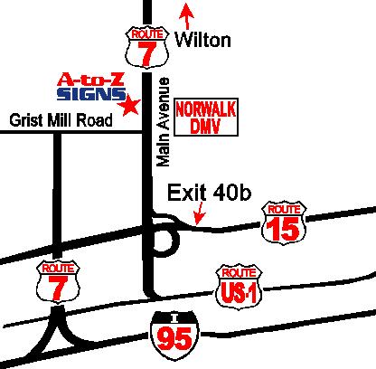 - Take Route 7 Southbound through Wilton - Once you go over the Wilton-Norwalk line, A-to-Z Signs is 1/4 mile on the right hand side (next to Starbucks)