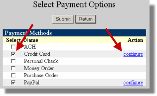 Select the types of payments you will accept by clicking on the respective boxes. Click on the configuration where applicable. Only the payment types you check will appear when someone places an order on your website.