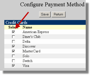 If you selected the "configure" link next to the Credit Cards, you will see a list of credit cards and gateways. You should select the credit cards you will accept. For this basic course we will not discuss the gateway section of this page. (A gateway is required to accept and process credit cards on-line and to receive the money in your account automatically.)
