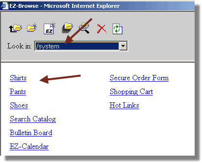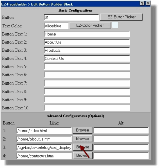 There are many ways to link to your Category list of products. In this example, we will create the link from a "Button Builder" block in EZ-PageBuilder. In real practice, you can link to your catalog anywhere you can put a link using EZ-NetTools. The introductory course to page builder used this block to build the buttons in the simple page. Enter "EZ-PageBuilder" from the Construction Tools menu. Choose the page you want the link on. If you only have one page then choose "Work on Home Page." Click the "Continue" button. While editing or creating a Button Builder block, click on the "Browse" button next to the "link" box for the button you want. (Remember we are only using the Button Builder Block as an example. You can create this link in nearly all of the PageBuilder Blocks that have links.)