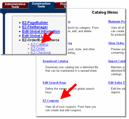 The EZ-Coupon tool is part of the EZ-Catalog system. Therefore, you get to the EZ-Coupon maintenance screens starting from the “Construction” tab, click on EZ-Catalog. Then click on the “EZ-Coupon” link.