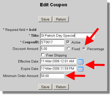 You are now at the Edit Coupon page. We will give this coupon a title of “St Patrick Day Special” and a coupon id of “ST0617.” By default the coupon will be active. In the discount amount enter “5.0" and check the “Percentage” radio button. Since we will not include free shipping, leave that box unchecked. For effective dates, enter March 11 through March 17. In the “Minimum Order Amount” enter $50.00. Then click save.