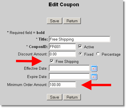 Now, add the second coupon by clicking on the "Add Coupon” button again. Give this coupon a title of “Free Shipping” and a CouponID of “FR001.” Leave the Active box checked. Since this coupon does not have any other discounts and is always valid, leave the rest of the fields blank except for the Miniumum Order Amount which should be $100.00. Click save.