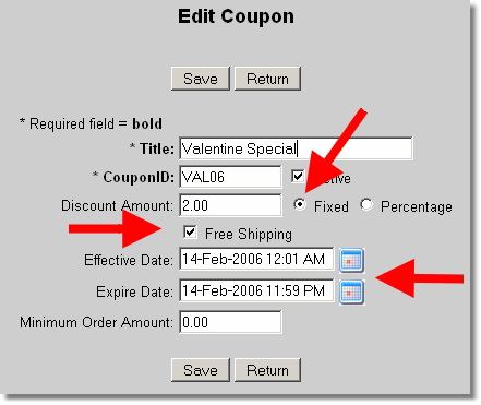 Now, add the third coupon by clicking again on “Add Coupon.” Enter a title of “Valentines Special” and ID of “VAL06." Enter a discount amount of $2.00 and check fixed. Check the “Free Shipping” box. Enter effective date and Expire date of February 14. Leave the minimum order amount at 0.00. Click the save button.