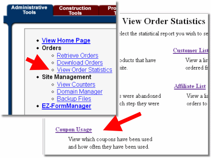 You can see how many orders have used each coupon in the Coupon Usage report. To get to this report from the “Administrative” section, click on the “View Order Statistics” link.