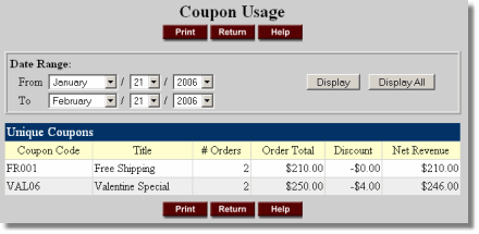 Then click on the “Coupon Usage” link. The report will show each coupon that has been used indicating the Coupon code, the title, the number of orders, the total of all the orders, the amount of the discount, and the net revenue. This report does not reflect the cost of free shipping however.