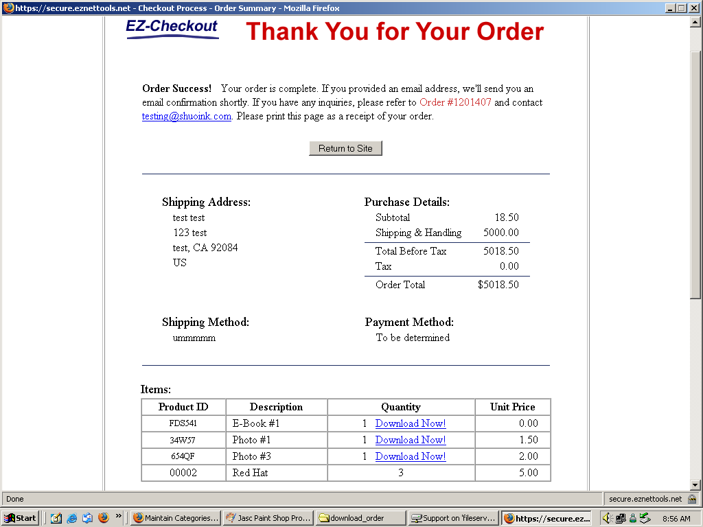 Using JavaScript, you can modify this order page so that digital products (videos, e-books, mp3s, etc... ) will have a "Download Now!" link so that your customers can immediately download the product they have purchased. The JavaScript code contains a list of product stock numbers and links. It will compare the products the visitor has purchased with the list of digital products. If the product purchased is on the list of digital products, the JavaScript code will add a download link next to the product.