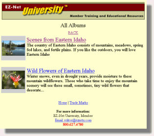 Using the All Albums Page. In addition to the pages created for each album, there is a page created by the system that lists and links to each album. For some account types this will be the best way to link to and show your album, especially those whose account does not include EZ-PageBuilder. The "All Albums" page will display the first thumbnail, the title, and the first part of the description of the each album. See the example below.