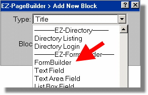 Now we will build the form. Select the place on the page where you would like to create your form. Then add a “Form Builder” block from the list of available blocks. Remember that the “Form Builder” block is like an envelop that controls the overall function of the form and “contains” each of the form blocks.