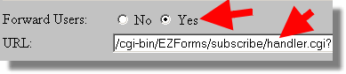 - For the URL enter the following URL exactly (on this page, the URL may wrap to the next line.) Since the URL you enter is larger than the field on the block, only part of it will be visible: http://www.yourdomain.com/cgi-bin/EZForms/subscribe/handler.cgi?session_id=[session_id]&submitter_id=[customer_id]. Substitute your domain name into the previous string. (If you do not have a domain name, then begin with "/cgi-bin/..." as you see in the image below) What you enter in this field is what makes this form function differently than any other forms.