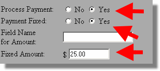If you desire to process a payment with this form, you will need to configure the payment part of this segment. - Further down in the “Advanced Section” check the “yes” button for Process Payment. (Note: this script will still work even if you do not require an associated payment.) In my example, I have selected a fixed payment of $25.00 so I enter this information.
