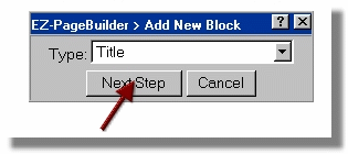 In the "Add New Block" window, you will find a drop down menu with a number of options. These are the different types of blocks you can use in EZ-PageBuilder. To add a headline to your page simply choose the Title block and click the "Next Step" button.