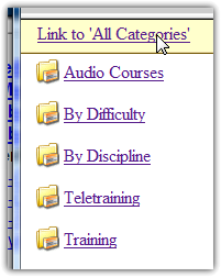 Because EZ-Catalog Pages are not static files in your account, you must link to them in a different way. First, choose "Catalog" from the "View" option in the top-right corner. This will put EZ-Browse into catalog mode, where file type is not applicable. Now instead of dealing with files and folders, we are dealing with products and categories. You can link to a product, a category of products, or the entire catalog. To link to the entire catalog, simply click "Link to 'All Categories'" at the top. Then hit the open button. If you want to link to a category, open up the category, click on "Link to'Category Name'", and hit the open button. If you want to link to a specific product, open up the category that contains it, click on the product name, and hit open.