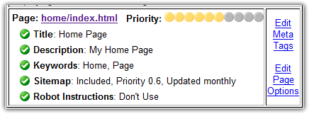 To edit any of the settings you see listed in EZ-PageManager, you'll use the links that you see listed on the right side. Edit Meta Tags allows you to edit the title, description, keywords, and robot instructions, as well as many other options that embed hidden information about your web page. Edit Page Options allows you to set sitemap information as well as many other options for the web page.